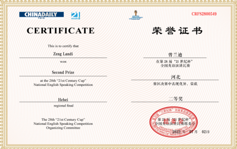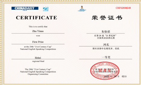 近日,第28届“21世纪杯”全国英语演讲比赛组委会传来喜讯:koko体育朱怡诺同学(指导教师:赵娟)获得河北赛区一等奖,曾兰迪同学(指导教师:霍雨光)获得河北赛区二等奖。另有46名同学获得校级奖项,获奖名单见附件,自本通知发布之日起,请关注钉钉群通知领取获奖证书。