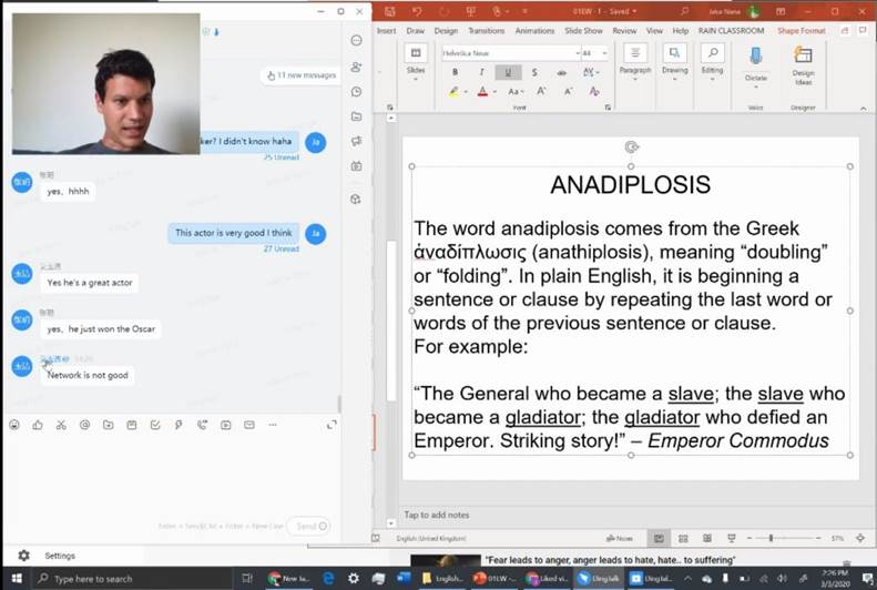 3月2日是学校正式开展网络教学的第一天,koko体育官网所有教师严阵以待,学院成立了在线教学技术互助组以保障教学的有序开展。经过所有教师辛勤付出和共同努力,第一天的各项教学活动顺利开展,学院教师完成课程后通过钉钉工作群进行了授课经验交流和总结。值得一提的是koko体育外籍教师Jake Nana在新西兰奥克兰市也按照学校和学院的各项部署通过网络开展了教学,学生互动和反馈良好。另外面向全校范围的大学英语课程在近一年实现了教材的更换,新版教材配备的移动端i学平台在此次疫情期间发挥了积极的作用。学生登录平台可以进行自主学习,并完成作业,不仅解决学生没有纸质教材的问题,平台还可对学生学习情况和作业完成情况进行记录,有助于教师充分了解学生课下学习情况。