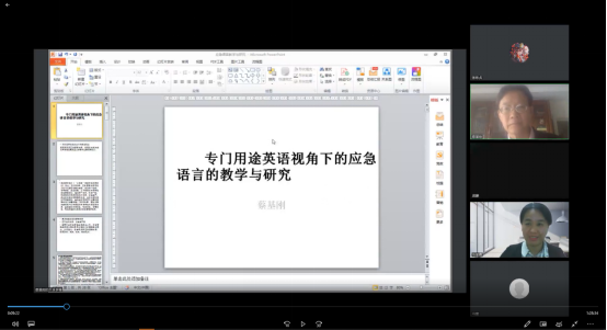2022年10月20日14:30,受koko体育官网邀请,复旦大学博士生导师蔡基刚教授在线上“腾讯会议(926-266-553)”平台为koko体育师生做了题为“专门用途英语视角下的应急语言的教学与研究”的学术讲座。讲座由koko体育官网院长池丽霞教授主持,koko体育官网全体教师及部分学生参加。