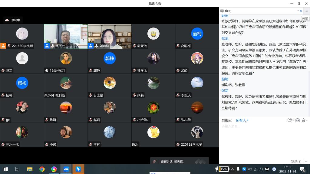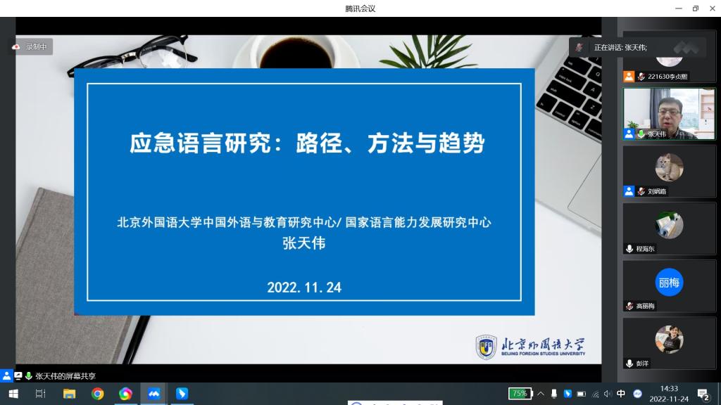 2022年11月24日14:30,受koko体育官网邀请,北京外国语大学博士生导师张天伟教授在线上“腾讯会议(293-791-507)”平台为koko体育师生做了题为“应急语言研究:路径、方法与趋势”的学术报告,该报告是koko体育应急语言服务系列讲座之三。讲座由koko体育副教授刘娲路主持,koko体育官网全体教师、部分学生聆听了报告,同时吸引了其他高校同仁及学生参会。