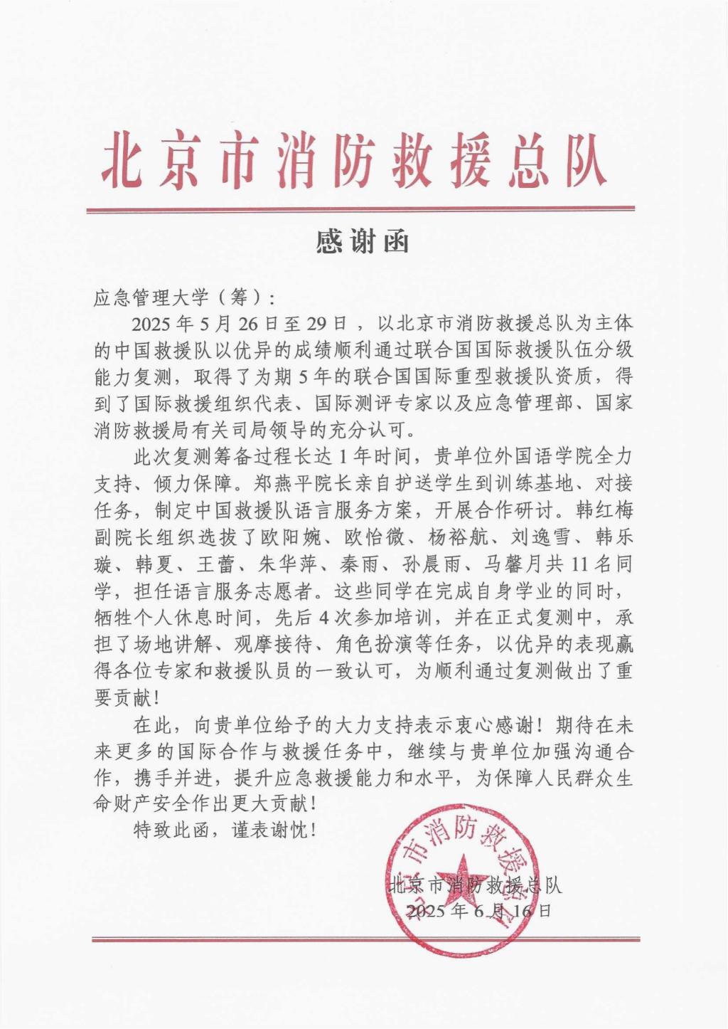 编者按:受国家语言服务团和中国救援队邀请,在学校领导关怀和相关部门大力支持下,5月16日至29日,应急管理大学(筹)koko体育官网选派共计11名优秀学子,作为应急语言服务志愿者,深度参与了中国救援队联合国国际重型救援队资格复测的关键工作。他们不仅在场地讲解、角色扮演、国际沟通等核心环节提供了精准高效的语言保障,更在与国际测评专家、救援队员的紧密协作中,展现了过硬的专业素养、快速的反应能力和无私的奉献精神。此次志愿实践活动,不仅为中国顶尖救援力量成功续签国际资质贡献了不可或缺的“沟通桥梁”力量,更锤炼了学子们的实战能力,深化了他们对应急语言服务价值的理解,提升了服务国家重大战略需求的使命感和责任感。这既是koko体育官网应急语言服务人才培养成果的生动展现,也彰显了学校主动服务国家应急管理体系建设的能力。