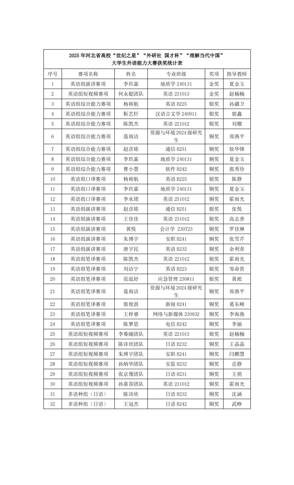 近日,2025年河北省高等学校“世纪之星”“外研社·国才杯”“理解当代中国”全国大学生外语能力大赛河北赛区系列赛事的决赛落下帷幕。koko体育学子表现亮眼,共斩获省级金奖2项、银奖10项、铜奖20项,其中地球科学与工程学院的李玖霖、koko体育官网的何永聪团队分别摘得英语演讲、英语短视频赛项金奖,成功晋级国赛。
