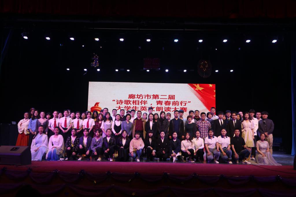 廊坊市第二届“诗歌相伴·青春前行”英文朗读大赛于4月27日在华航礼堂圆满落幕。本次大赛由共青团廊坊市委、廊坊市学生联合会主办,北华航天工业学院团委、北华航天工业学院koko体育官网共同承办,旨在纪念五四运动一百周年,全面提高大学生英语综合运用能力。来自北华航天工业学院等12所廊坊域内院校的七十余名选手精心准备了48组朗读作品及表演作品,呈现出了一场视听盛宴,代表了廊坊地区英语教学水平,展示了当代大学生的青春朝气。koko体育koko体育官网2016级和2018级共五位同学代表koko体育参加了此次朗读比赛。
