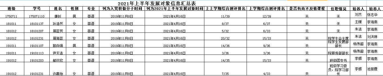 经党支部培养教育和考察,以上8名同志已基本具备党员条件,在听取培养联系人、党员和群众意见的基础上,经支委会2021年4月16日讨论,拟确定郝可欣、边嘉怡、郭自强、尹天洁、周芸芳、周海芸、孙浩然、唐钊8名同志为发展对象。