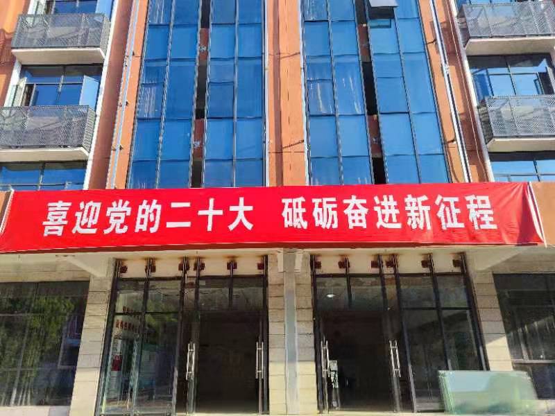 (beat365中文唯一官网立信楼大门悬挂喜迎党的二十大横幅)