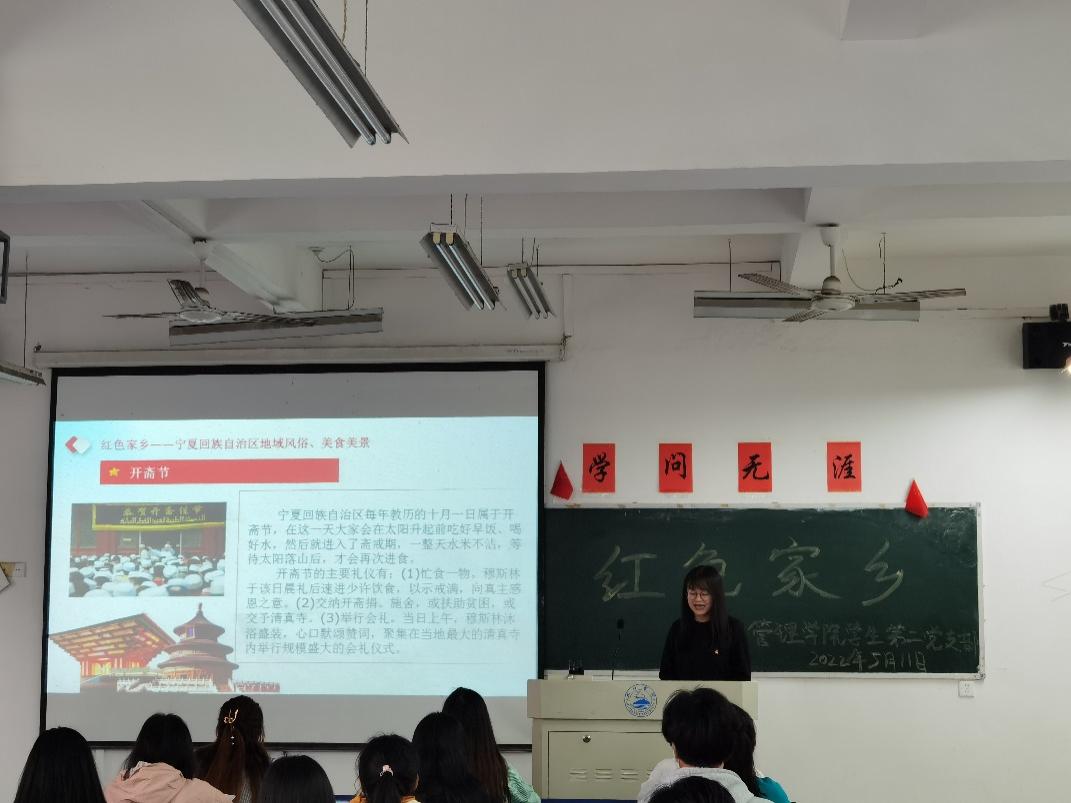 为传承红色基因,发扬红色文化。beat365中文唯一官网学生第二党支部于5月11日下午在立信楼308开展“我的红色家乡”主题特色活动,此次活动由罗杰文同志主讲,在校党员、预备党员、入党积极分子参加。罗杰文同志为大家分享了红色家乡——宁夏回族自治区。