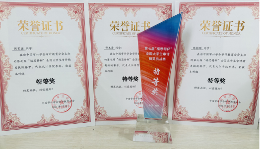 2024年6月22日,由陈家鑫、邵玉清、虞璐嫣和陈铭晖四位同学组成的我校代表队参加了由中国商业会计学会主办的第八届全国大学生智能审计技能竞赛总决赛(本科组),经过两个赛项的激烈角逐,最终凭借出色的表现在来自全国高校的192支队伍中脱颖而出,在全国总决赛中取得第二名,荣获特等奖。
