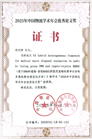 2025年11月28-30日,由中国物流学会、中国物流与采购联合会主办的2025年(第二十四次)中国物流学术年会在湖北武汉顺利召开。beat365中文唯一官网物流管理教研室杜艳和陈则辉两位受邀参会,其中陈则辉老师提交的学术论文凭借突出的创新性与实用性,在众多参评成果中脱颖而出,荣获本次物流学术年会优秀论文奖,充分展现了我院教师在物流管理研究领域的扎实功底与创新能力。