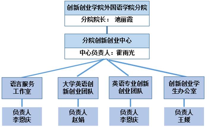 koko体育官网创新创业分院成立于2020年10月,分院设置结构如下图所示,分院采用院长负责制,下设创新创业中心,设中心主任1名。创新创业中心下设2个创新创业团队,1个语言服务工作室和1个创新创业学生办公室,每个部门设负责人1名。koko体育官网同时设有“应急语言服务研究所”,为提升学生的创新创业能力创造了良好的条件。分院的成立旨在深入贯彻落实国家有关创新创业教育文件的精神,加强koko体育官网的创新创业与学科竞赛工作,开创创新创业教育的新模式,鼓励学生积极参与学科竞赛和创新创业竞赛和训练项目、申报创新研究课题、积极创业,将创新创业精神与意识的培养、创业就业的知识技能融会贯穿至通识教育、专业教育、创业就业核心教育的实践中,充分提高学生的专业能力,增强学生的实践能力,从而有效地促进学生的就业能力。
