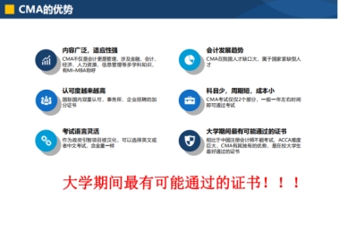 CMA考试科目少,仅有2门课程;考生可选择中文或英文考试;在全球180个国家和地区设有400多个考点,中国的40个主要城市设有考点,每年设有3个考试窗口。