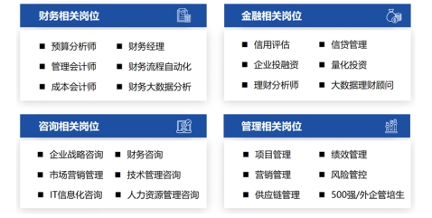 CMA实验班学生未来拥有广阔的就业选择面,可在500强企业、大型跨国公司、大型国企与金融机构等从事智能财务、管理咨询、商业分析、市场营销、投资管理等各类高薪职业。