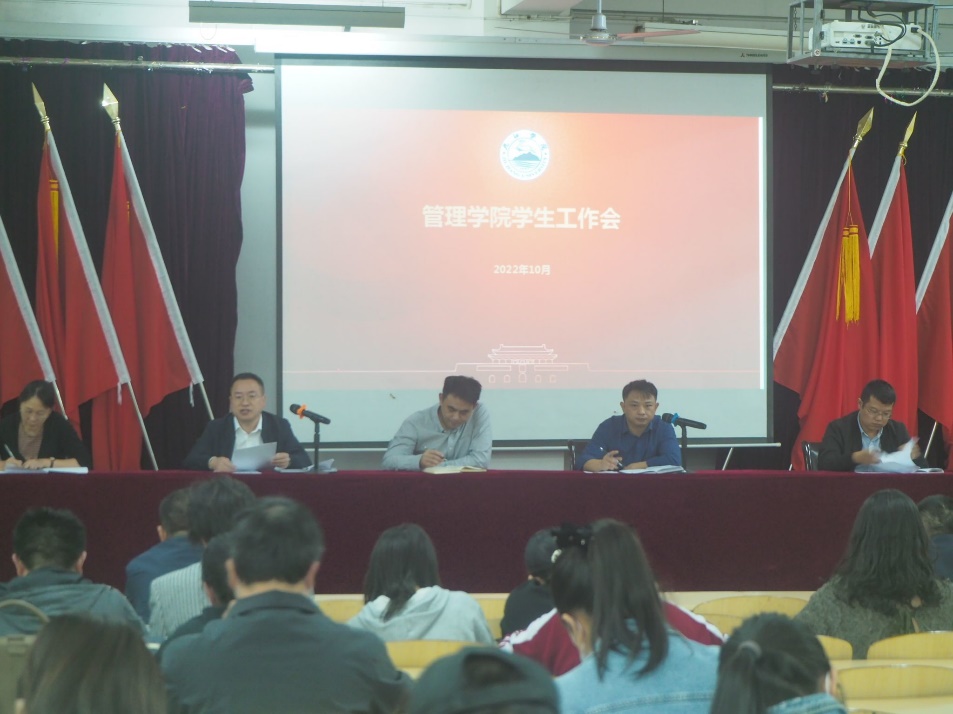 会上,学生科科长周龙波对学院学生工作作了全面介绍,就近期疫情防控、校园安全、学生日常管理、资助、毕业生就业等工作作了布置。学生科副科长李春就国家“三金”评审,三好学生、优秀学生班干、文明班级评选,心理健康教育、教室宿舍卫生管理等工作作了详细介绍。思政科副科长郭振就学生思政教育、团员发展、团费收缴、团员档案管理、文艺、体育、学风建设、学科竞赛、志愿服务及其他第二课堂活动等工作作了详细介绍。