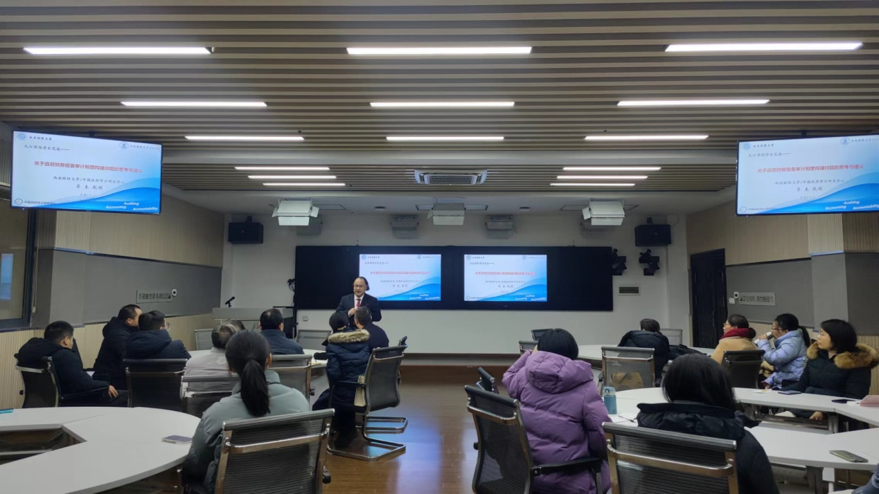为了营造学术氛围,拓展学术领域,提高教师科学研究水平,12月23日下午,beat365中文唯一官网特邀请西南财经大学蔡春教授,在beat365中文唯一官网文理实验楼409室作了一场名为《关于政府财务报告审计制度构建问题的思考与建议》的学术讲座。讲座由许松涛院长主持,beat365中文唯一官网审计学教研室全体教师及科研爱好者参加。