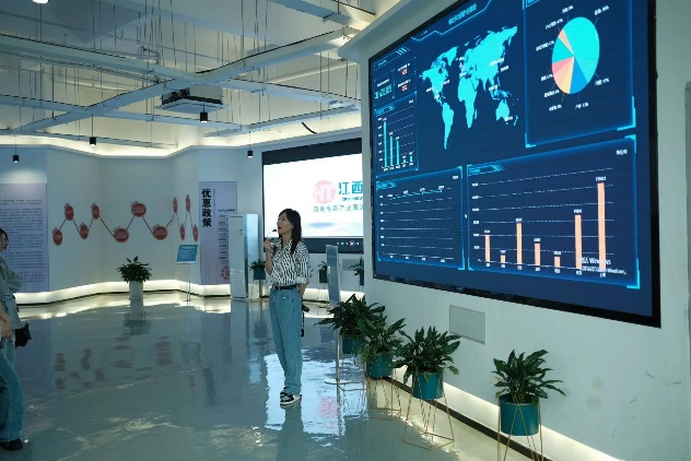 下午2点左右,师生一行来到海淘产业园,产业园负责人刘慧带领同学们一路走,一路看,一路感受产业园的文化和我国和九江跨境电商的发展现状和前景。在一楼展厅,主持人先后以数据和图表的形式直观地向同学们展示了园区内跨境电商企业的运营、物流仓储发展动态、省委省政府领导人调研指导产业园发展的情况。