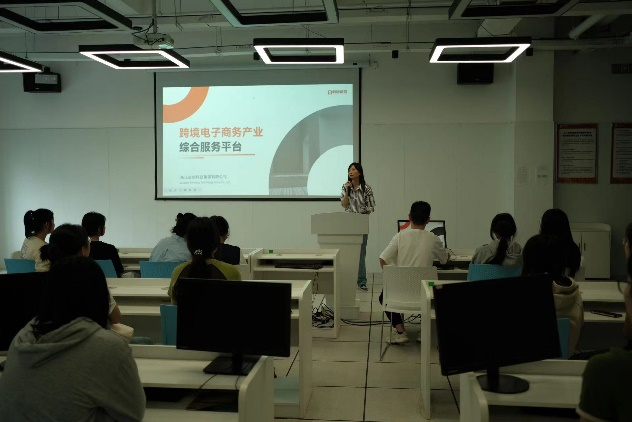 随后在二楼培训室,产业园负责人以PPT的形式进一步向同学们介绍了产业园运营方必创企业集团的性质和服务内容。作为跨境电子商务产业综合服务提供方,必创提供全方位的跨境电商生态服务,联合多家国际知名电商平台助力中国企业开辟网上丝绸之路,实现品牌出海,货通全球,形成了集品牌孵化、人才培养、国际物流、海外仓、跨境支付、知识产权、产品供应链等全链条的生态服务体系。